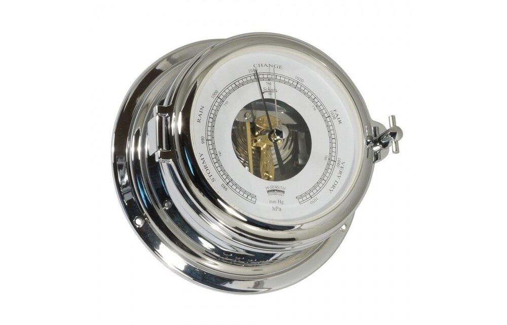 De barometer heeft een behuizing van verchroomd messing en beschikt over een witte wijzerplaat die onderverdeeld is in hPa/mm.